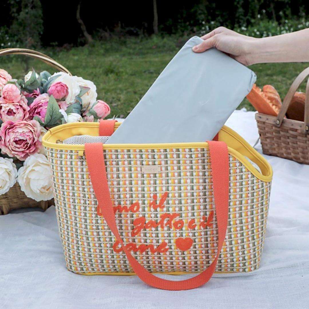 Carry your feline friend in style with this gorgeous woven bag. It features a convenient top opening with zipper closure so you can get your cat in and out easily. The lightweight fabric makes it easy to carry, while the interior is lined with mesh to prevent scratches. It comes with a printed scarf that adds bohemian flair to any outfit. Designed with your cat’s safety and comfort in mind, it has a mesh top that allows for ventilation and airflow.
