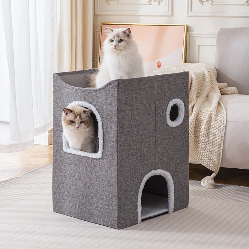 Transform your cat’s living space with our innovative foldable cat house featuring a built-in scratching board. This all-season cat villa provides the perfect combination of comfort, entertainment, and privacy for your feline friend. Designed with two arch-shaped entryways and multiple levels, it creates an engaging environment that cats naturally love.
