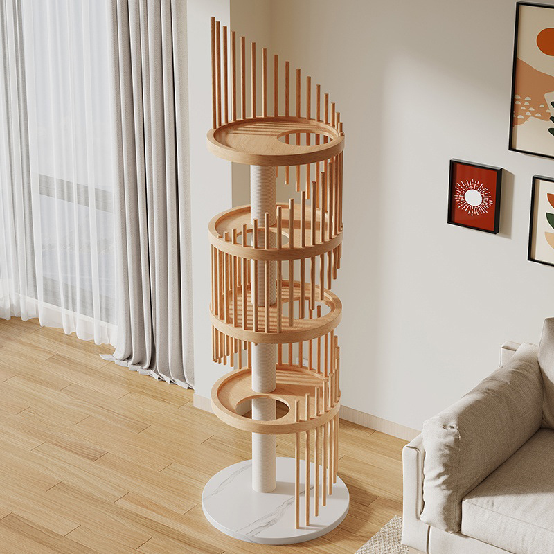A premium solid wood cat tree with minimalist vertical design, specially designed for multi-cat households, offering durability and space-saving elegance.