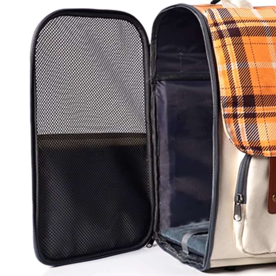 This cat backpack has a brilliant orange and brown checkered design and oozes trendy preppy feelings, making every outing a fashion statement. Imagine enjoying a leisurely stroll through the park, having a coffee at your favorite pet-friendly café, or going on a weekend getaway — all while your cat rides in comfort and style.